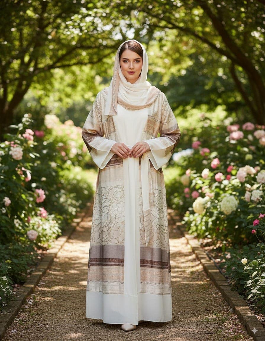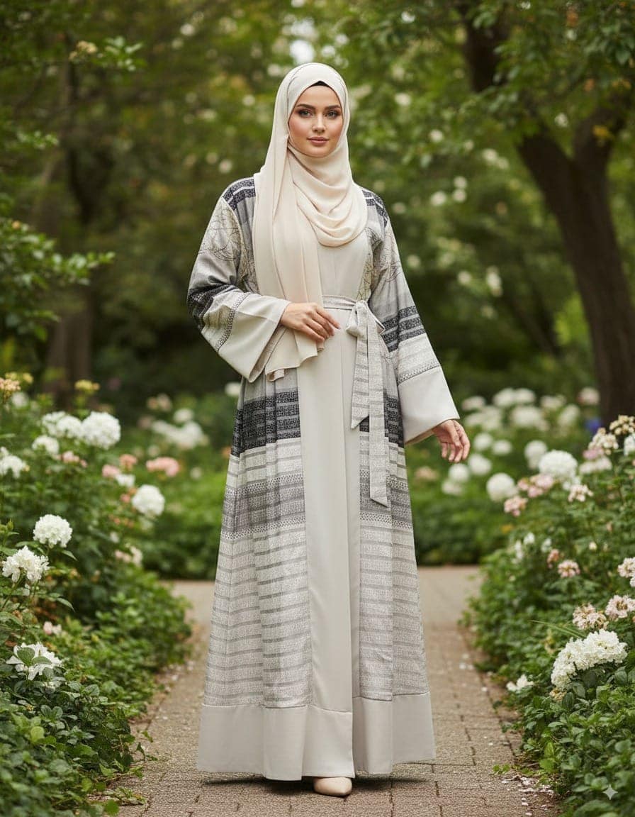 Made from lightweight Dubai tissue fabric with delicate thread work detailing. Fully layered with soft Georgette for a smooth, comfortable drape. Comes with a matching hijab and adjustable waist belt for a complete, elegant look.