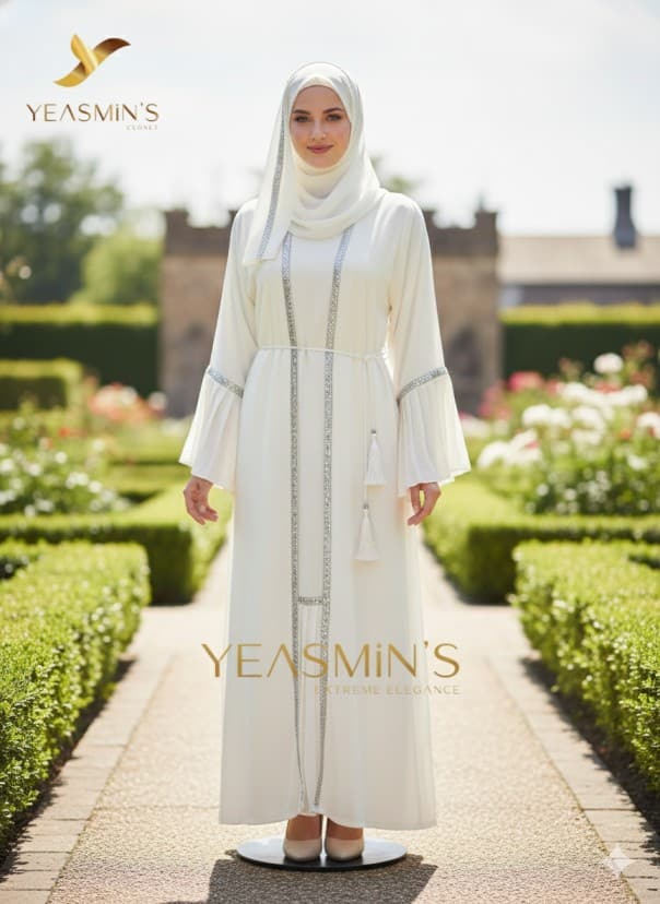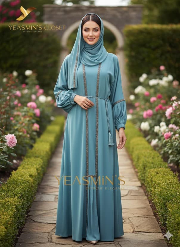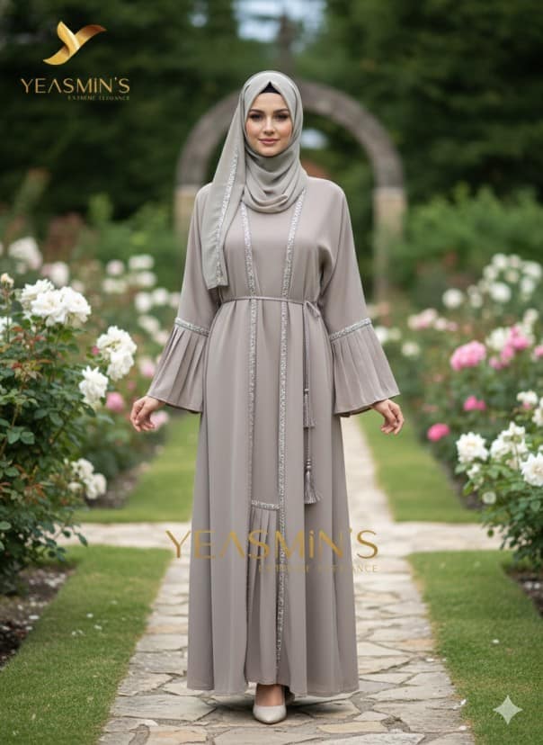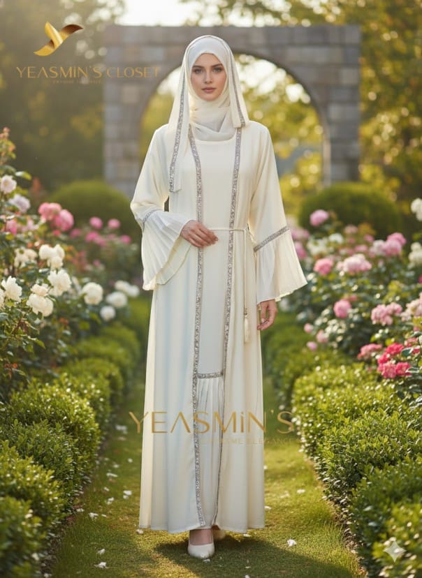 The abaya with metallic silver embroidered lace or sequins trimming the front vertical panels and sleeve bands. The belt is a thin rope, adorned with tassels, and the sleeves showcase layered bell designs from the elbow with gathered flounces. The matching chiffon hijab complements the set. Crafted from soft, lightweight “Dubai Zoom” fabric, this abaya is flowy, wrinkle-resistant, and perfect for elegant wear.